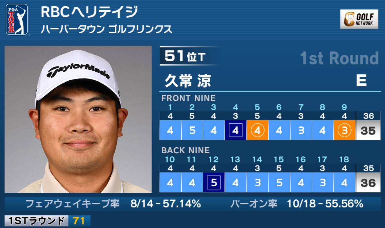米男子ツアーのシグネチャーイベント、RBCヘリテイジは17日、米サウスカロライナ州のハーバータウンゴルフリンクス(7,213ヤード・パー71)で第1ラウンドが行われ、久常涼は2バーディ、2ボギーの「71」で回り、イーブンパー51位タイとなった。