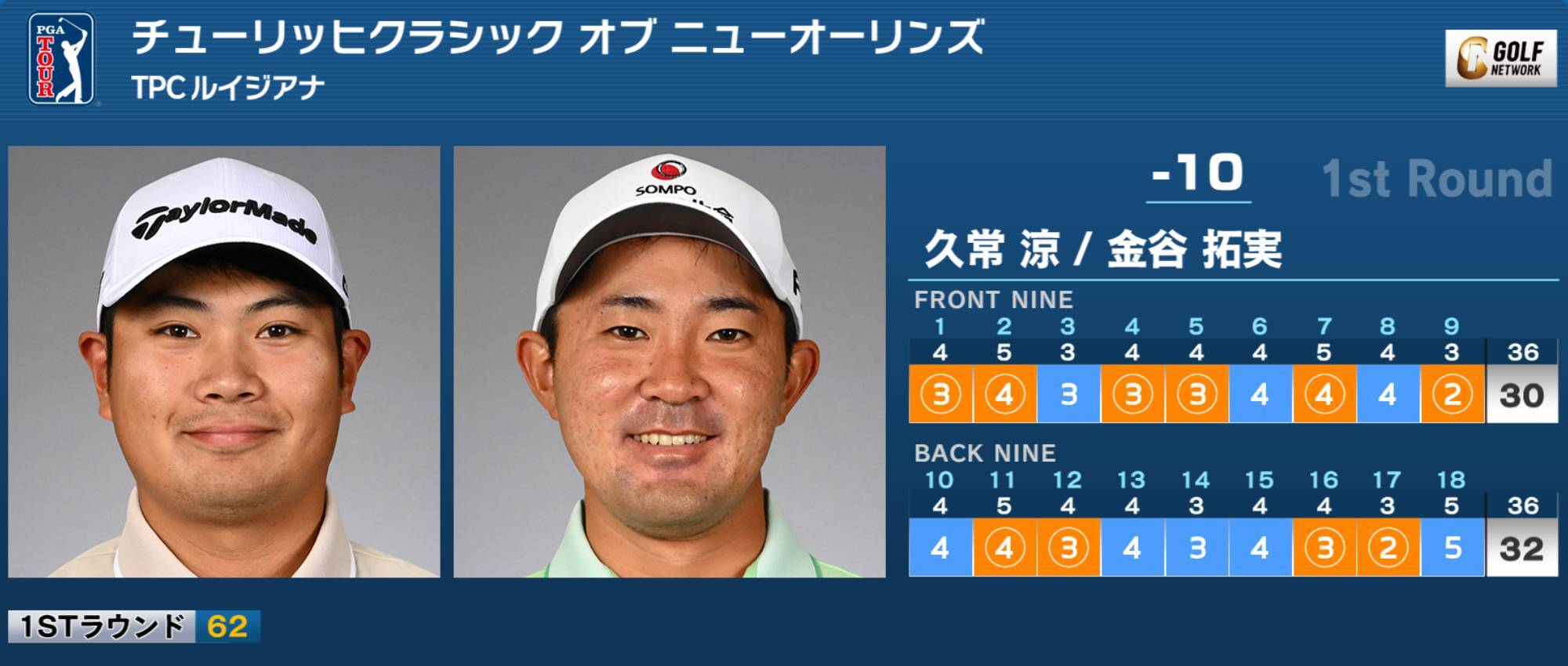 米男子ツアーのチューリッヒクラシック オブ ニューオーリンズは24日、米ルイジアナ州のTPCルイジアナ(7,425ヤード・パー72)で第1ラウンド(フォアボール方式)が行われ、久常涼&金谷拓実は10バーディ、ノーボギーの「62」を叩き出し、トップと4打差の10アンダー7位タイ発進を決めた。