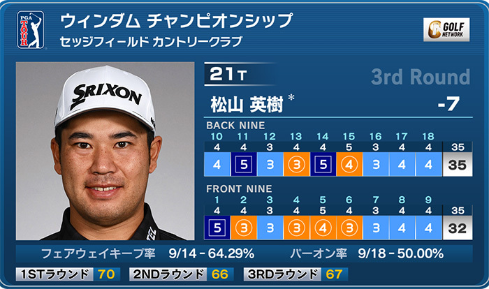 米男子ツアーのウィンダムチャンピオンシップは2日、米ノースカロライナ州のセッジフィールドカントリークラブ(7,131ヤード・パー70)で第3ラウンドが行われ、松山英樹は41位タイから6バーディ、3ボギーの「67」と伸ばし、通算7アンダー21位タイに浮上した。